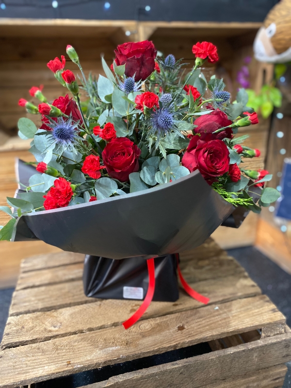 Luxury upon luxury! This is a grand sized arrangement which includes x6 roses, lashings of fresh eucalyptus, gorgeous thistles and carnations....it's a beauty!