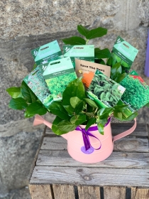 Wee wall hanging watering can filled with seven packets of seeds either flowers, vegetables or herbs, all easy to grow in this area.